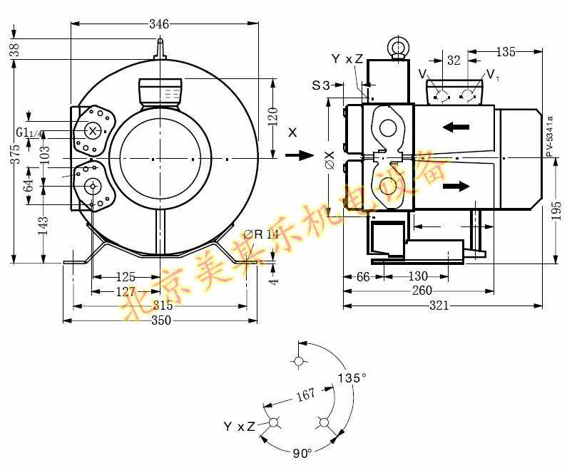4GH410/1.1k0w高壓鼓風機側(cè)面圖,風機的進出風口位于電機的左側(cè)