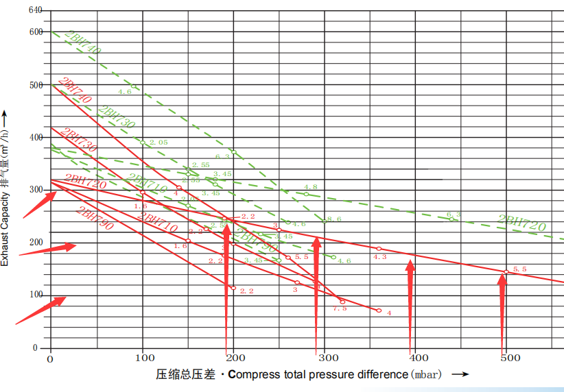 從圖中箭頭所示中可以看出720雙葉輪這款風(fēng)機的整體運行曲線,橫線為流量情況,堅線代表壓力情況,可以看出運行線是往下走的,表示壓力越高的時間,流量降低的也就越厲害。