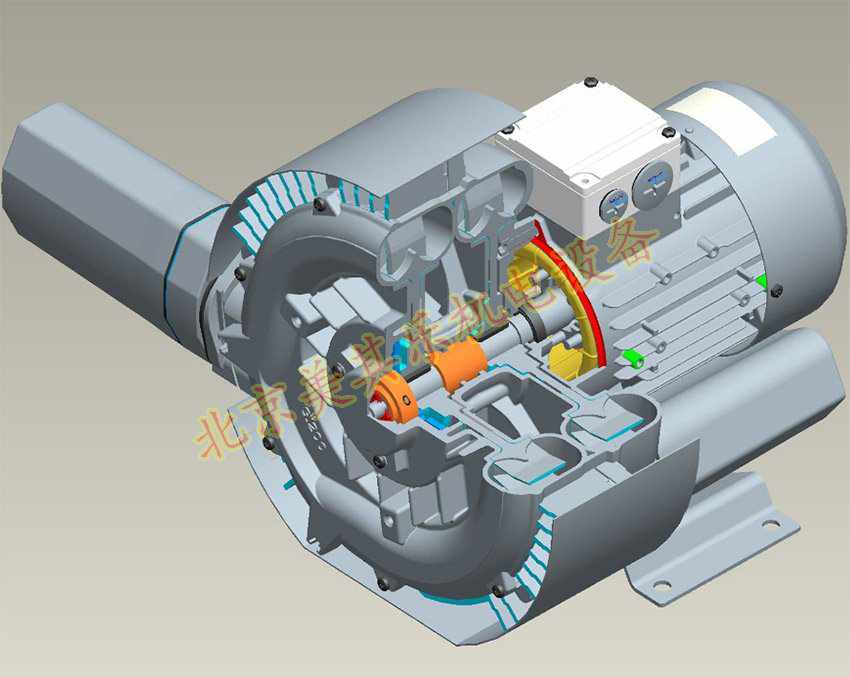雙段風(fēng)機就是代表雙級、雙葉輪的意思,里面是安裝有兩個葉輪的,與單段風(fēng)機相比,前泵頭要寬出一倍左右,而且出風(fēng)口也是開口在第二個葉輪泵體處的,單葉輪的則是在電機下方。